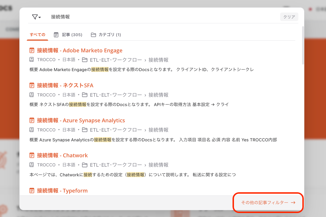 - 検索ワードの入力後「その他の記事フィルター」をクリックする必要があります。